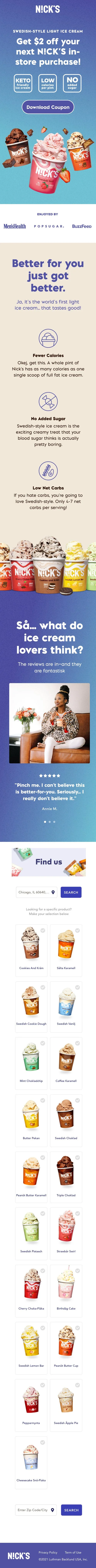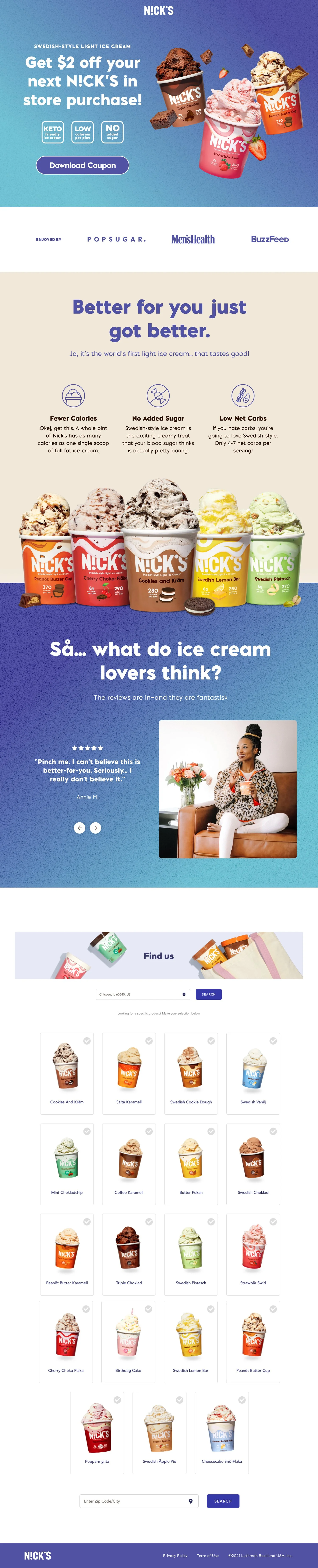 N!ck’s is a Swedish-style, low-fat, low-calorie, and keto-friendly ice cream sold at various grocery stores, including major chains like Albertsons, Safeway, Kroger, Ralphs, Target, and Walmart.